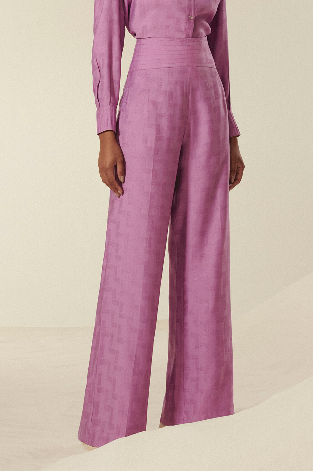 Explore elegance with our viscose jacquard pants. The pleats, asymmetrical stitched waistband and side zipper provide a sophisticated and modern look.