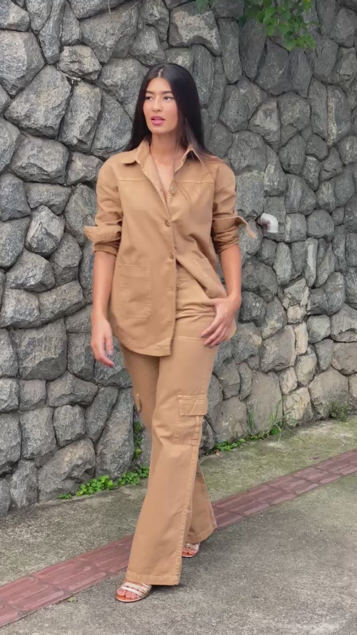 Cargo pants in a walnut tone with utility pockets and straight-leg fit. Stylish and comfortable, perfect to pair with the matching jacket.